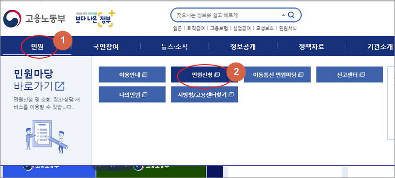 여기서 일자리 지원, 고용보험, 직업능력, 고용평등, 근로기준 등 여러 분야에 관련된 민원 신청을 온라인으로 할 수 있는데요.