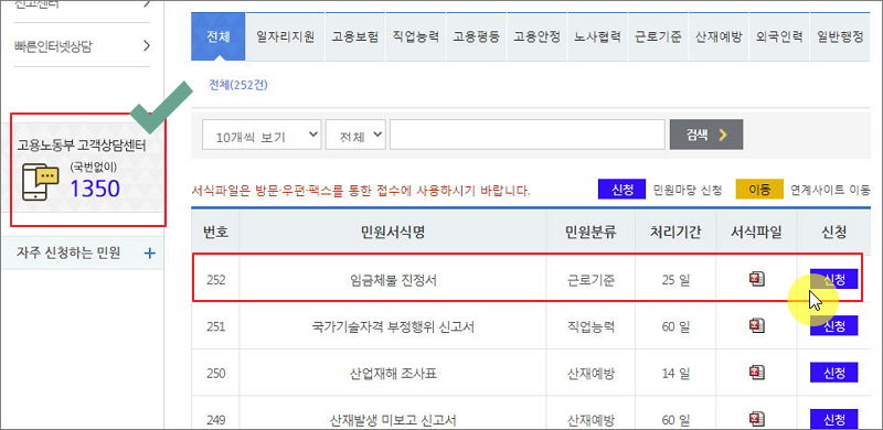 ▲ 임금체불 진정서 신청 클릭