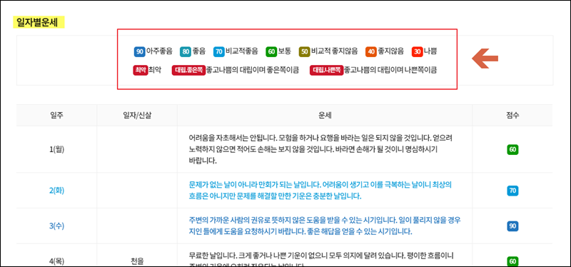 하루 단위로 공짜 운세를 알아보고 싶은 경우에는 월간종합운세 서비스를 이용해 보세요. 하루하루 나의 운의 점수와 함께 짤막한 해석을 만나볼 수 있어요.