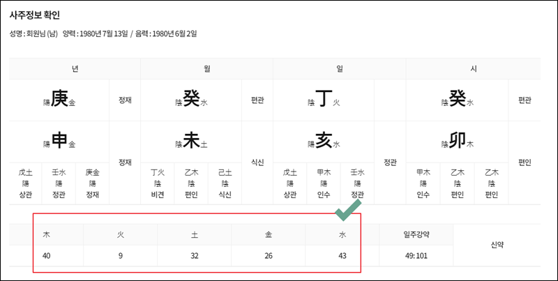 사주팔자 풀이를 보기에 앞서 사주명식이 나타나요. 모르는 한자로 되어 있어서 이해하기 어려운데요. 여기에서 오행 정도만 봐주면 돼요.
