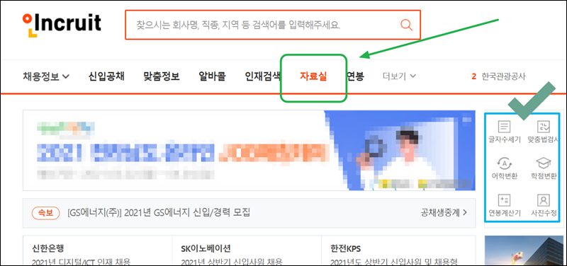 실시간 취업정보 사이트 인크루트에 접속했어요. 신입공채, 알바콜, 인재검색, 연봉 등 주요 서비스가 눈에 띄는데요. 자기소개서 예시의 경우 "자료실" 메뉴를 선택하면 돼요. 사이트 메인화면에서 오른편을 보면 글자수세기와 맞춤법검사 서비스가 있는데요. 자기소개서를 작성할 때 활용하면 좋은 TOOL 이에요.