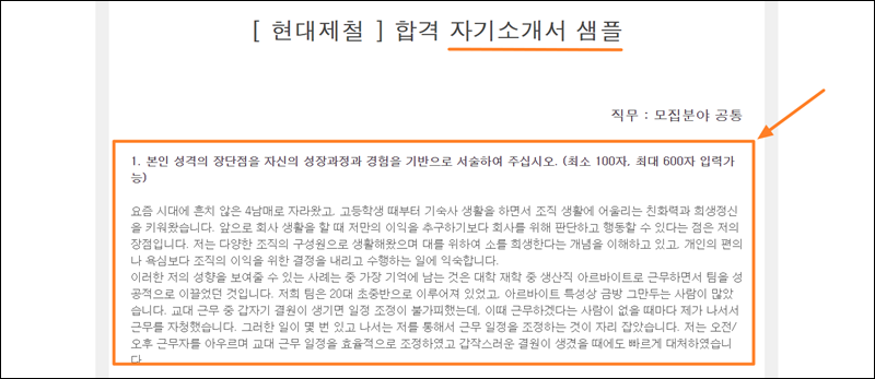 많은 사람들이 취업하길 선호하는 기업 중 하나인 현대제철에 합격한 사람의 자기소개서를 선택해 보았어요. 일반적으로 많이 묻는 성격의 장단점, 성장과정을 서술하라는 항목이 있네요. 보통 4개의 항목으로 구성되어 있는데요. 글자수가 정해져 있는 경우가 많아요. 여기서는 최소 100자, 최대 600자 입력 가능하다고 되어 있네요.