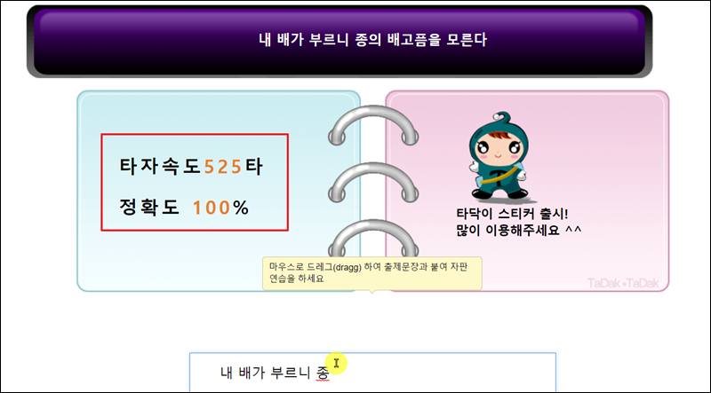 자판연습과 단어연습을 충분히 했다면 이번에는 문장 입력을 통한 연습을 해보세요. 실생활에서는 문장을 입력하는 경우가 많기 때문에 최종적으로는 문장 입력 연습을 많이 하는 것이 좋아요. 문장을 입력할 때에도 정확도와 타자속도 확인이 가능한데요. 무조건 빨리 입력하는 것이 능사가 아니고, 정확도를 100% 유지한 상태에서 속도를 늘려가는 것이 좋아요.