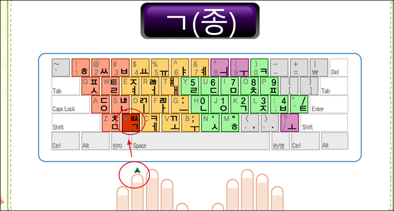 한글 자판연습 서비스를 실행해 보았어요. 이렇게 키보드와 손가락 이미지가 있는 화면이 나타나는데요. 화면에 표시된 문자를 표시된 손가락으로 누르면 돼요. 키보드에도 하이라이트 표시가 되어 있으니 해당 표시가 된 버튼을 정확하게 눌러주세요.