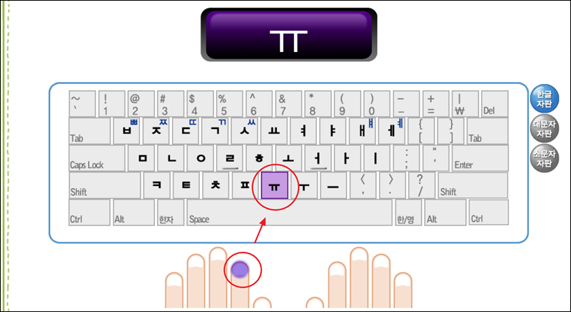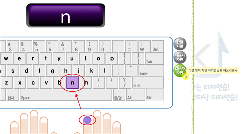 키보드 이미지에서 오른편을 보면 영문 자판으로 변경이 가능해요. 이를 통해 영문 자판연습 화면으로 변경할 수 있는데요. 영어 자판을 익힐 때에도 키보드 버튼을 누르는 손가락을 잘 알아두세요.
