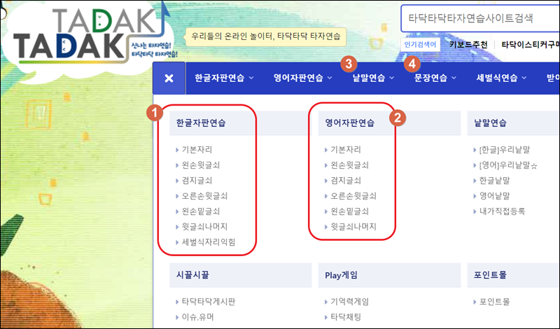 프로그램 설치 없이 바로 자판연습을 할 수 있는 사이트가 있어요. 바로 타닥타닥 타자연습 홈페이지인데요. 이곳에서는 한글은 물론이고, 영문 자판연습도 할 수 있어요. 키보드 자판을 손쉽게 익힐 수 있으니 하나씩 따라해 보세요.