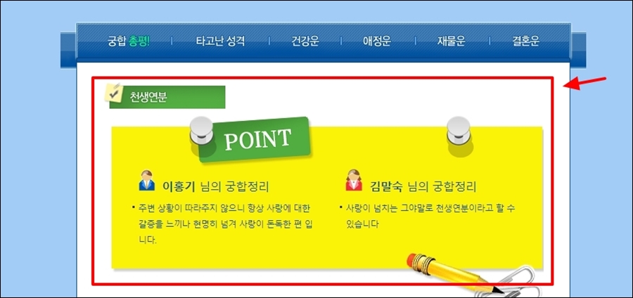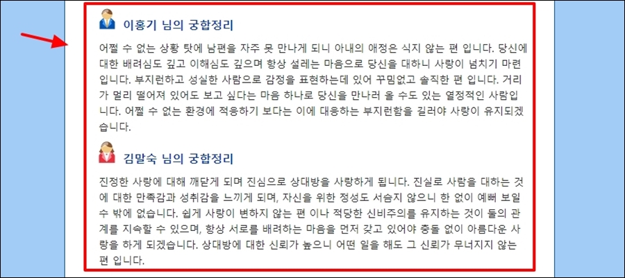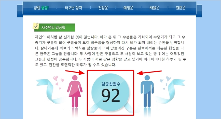 이곳은 관계에 대한 총평은 물론이고, 타고난 성격, 건강, 애정, 재물, 결혼 이렇게 다방면으로 상세하게 알아볼 수 있어서 좋아요.
