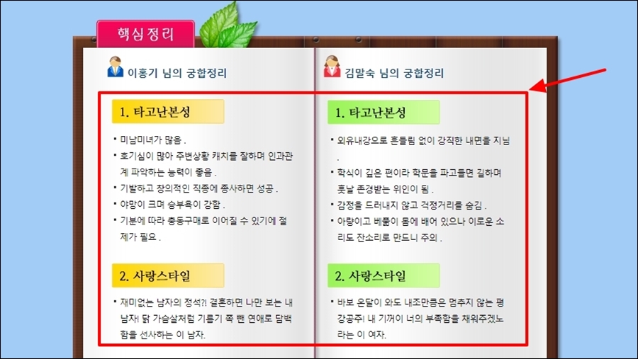 상세 풀이를 보기 이전에 핵심정리를 통해 간편하게 궁합 결과를 볼 수 있습니다.