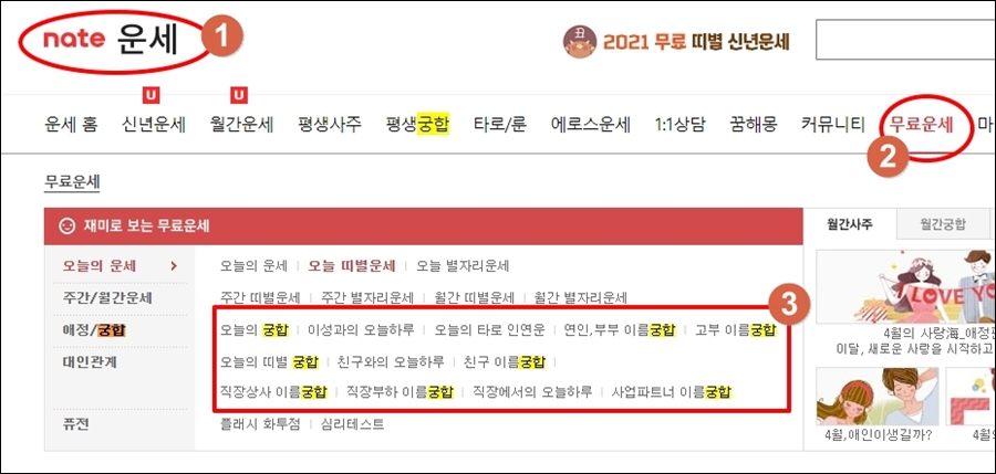 네이트 운세에 접속해서 "무료 운세" 메뉴를 클릭해 보세요.