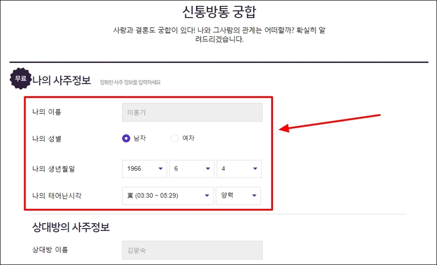 나와 상대방의 사주정보를 정확하게 입력해 주세요.