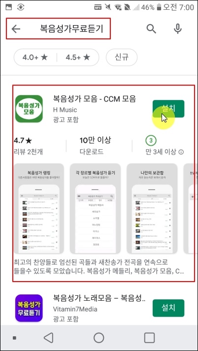 많은 복음송을 듣기 위해서는 스마트폰을 이용하여 어플을 하나 설치해야 합니다. 한 번만 하면 되기 때문에 어려움이 없습니다. "Play 스토어"를 실행한 후 "복음성가 무료듣기"를 검색합니다. 그럼 복음성가 모음 또는 CCM 모음을 이용할 수 있는 어플을 찾을 수 있어요.