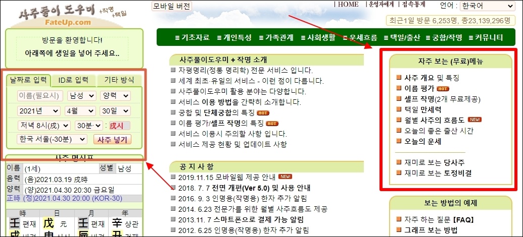 검색을 통해 홈페이지에 접속하면 좌측에 생년월일, 이름 등을 적는 부분이 있습니다. 정확하게 빈 칸을 채워주세요. 당사주는 태어난 날짜를 중심으로 앞날을 점치는 역술이기 때문에 더욱 정확하게 입력해야 합니다.