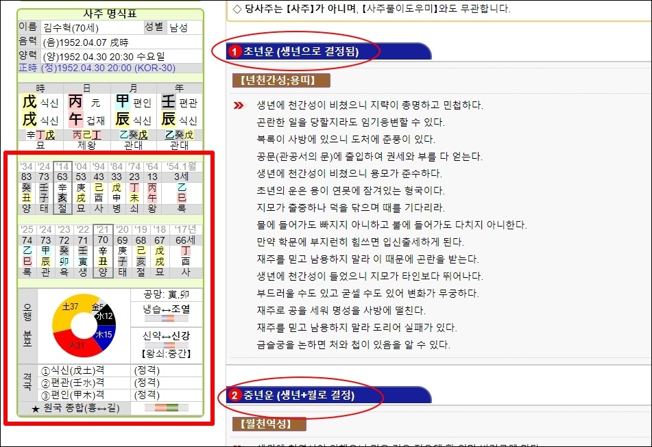 새롭게 화면이 바뀌면서 당사주 풀이를 읽어볼 수 있는데요. 가장 먼저 초년운, 중년운, 말년운을 볼 수 있습니다. 인생을 3가지 부분으로 나누어 각 시기에 나에게 어떤 일이 있는지 알려주는 것이죠.