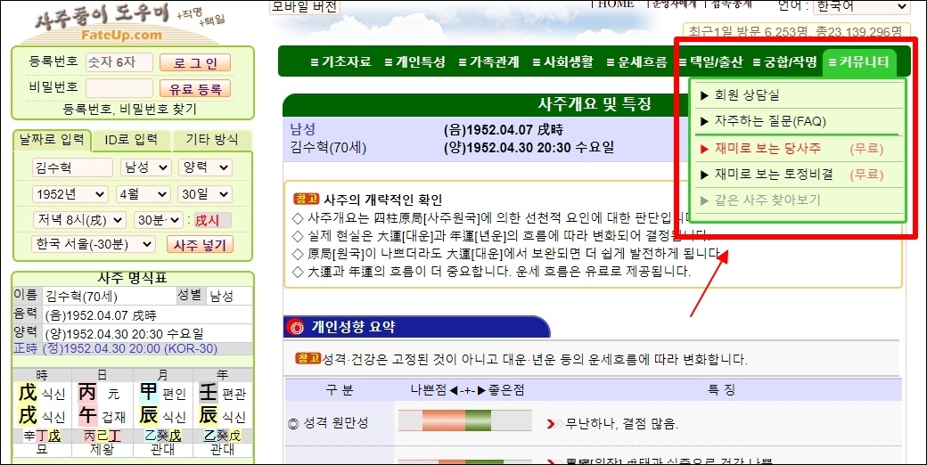 나의 사주정보를 모두 입력하고, 사주 넣기 버튼을 누르면 만세력 결과가 나타납니다. 이 상태에서 무료 당사주 보기 원한다면 우측 상단에 있는 메뉴인 "커뮤니티"를 클릭해 보세요. 그럼 "재미로 보는 당사주 (무료)" 서비스 버튼을 찾을 수 있습니다. 해당 버튼을 누릅니다.