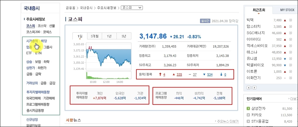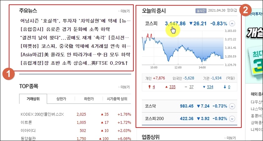 개인적으로 초보자의 경우에는 조금 복잡해 보이는 HTS보다는 네이버 금융 사이트를 이용하는 것이 더 낫다고 생각합니다. 정리가 잘 되어 있어서 금일 증시 현황을 살펴보기에 정말 좋아요. 투자할만한 종목을 찾기에도 용이하고요.