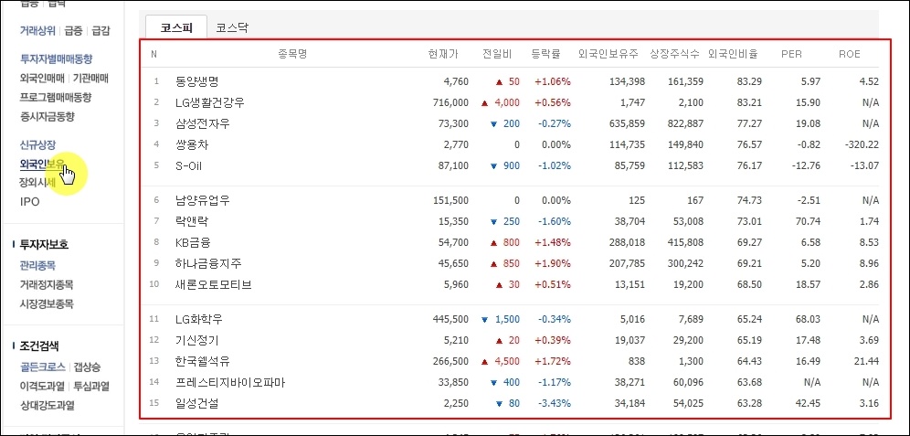 외국인이 많이 보유한 주식을 찾길 원하는 경우에는 "외국인 보유" 메뉴를 클릭해 보세요. 이에 해당하는 종목의 주식시세를 쉽게 살펴볼 수 있습니다.
