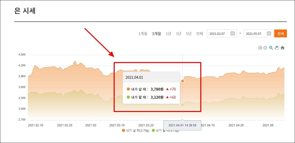 은에 대한 시세도 차트로 확인이 가능한데요. 은의 경우에도 내가 살 때와 팔 때의 가격 차이가 조금 있어요. 요즘에는 4천원 초반대의 가격을 형성하고 있네요.