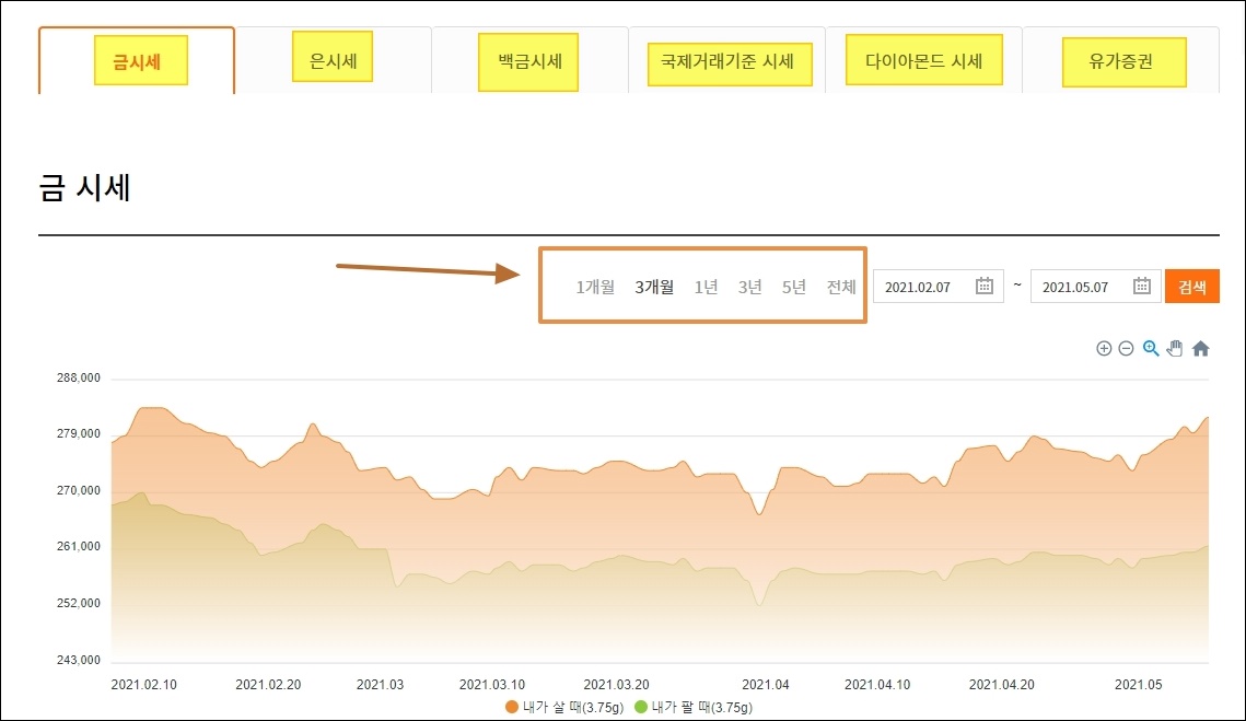 메뉴에 있는 금시세 조회 버튼을 클릭해 보세요. 그럼 여러 가지 광물에 대한 가격 흐름을 그래프로 확인할 수 있어요. 1개월, 3개월, 1년, 3년, 5년, 전체 이렇게 6가지 기간 동안 어떻게 한국 금시세가 변했는지 알 수 있는데요. 최근 3개월의 경우에는 살짝 하락하다가 다시 상승하는 모습이 보이네요.