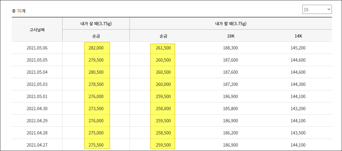 표를 통해서도 일별로 가격 정보를 확인할 수 있어요. 금 1돈은 3.75g 인데요. 한국에서는 1돈 기준으로 가격을 따져요. 외국에서는 1온스를 기준으로 하고요.