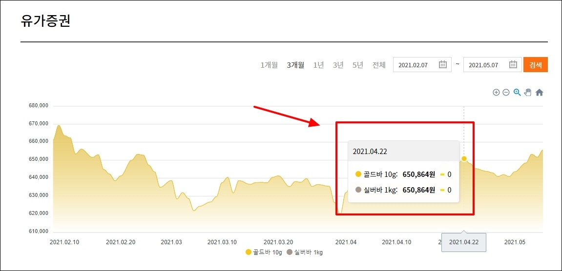유가 증권에 대한 가격도 여기에서 확인이 가능한데요. 골드바 10g과 실버바 1k 기준으로 된 가격 차트를 확인할 수 있어요.