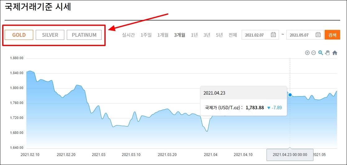 이곳에서는 한국 금시세와 더불어 국제거래기준 시세 확인도 가능해요. 골드, 실버, 플레티늄 이렇게 3가지 광물에 대해 알아볼 수 있는데요. 가격 흐름은 국내와 거의 동일하다고 할 수 있어요. 기준이 되는 중량만 다를 뿐이에요. 물론 미세하게 일정한 가격 차이가 있을 수 있죠.