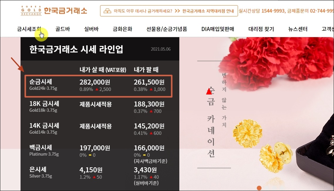 편하게 온라인으로 알아보기에는 한국 금 거래소 사이트를 이용하는 것이 좋습니다. 오늘 시세를 바로 확인이 가능하거든요.