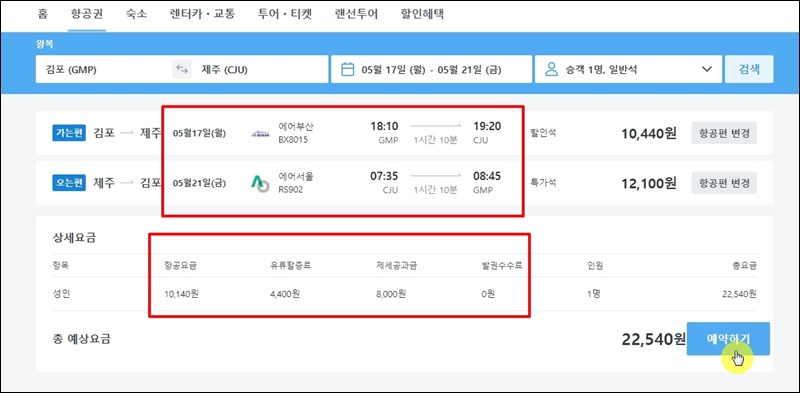 제가 여행 중에는 많은 돈을 사용하지 않아서인지 모르겠지만, 경비 중에서 교통비가 많은 비중을 차지해요. 이번 시간에 알려드리는 제주 여행 싸게 가는 법은 비행기표를 저렴하게 예매하는 것을 통해 진행할 건데요. 최근 서울에서 제주를 가는 왕복 비행기표가 22,540원 밖에 되지 않네요.