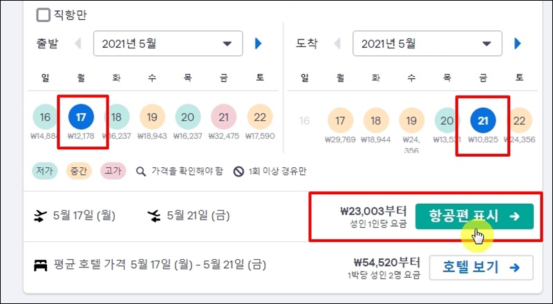 날짜 선택 후에는 출발 시간대와 이용할 항공사를 선택할 차례에요. 출발 시간대는 비행기에 탑승할 시간과 관련이 되어 있는데요. 싸게 가는 것도 좋지만, 여행 스케쥴에 맞게 정하는 것이 좋아요. 원하는 출발 시간대를 선택하면 점점 가격이 올라갈 수 있는데요. 그래도 여행 만족도가 중요하기 때문에 원하는 시간대로 설정하는 것이 좋습니다.