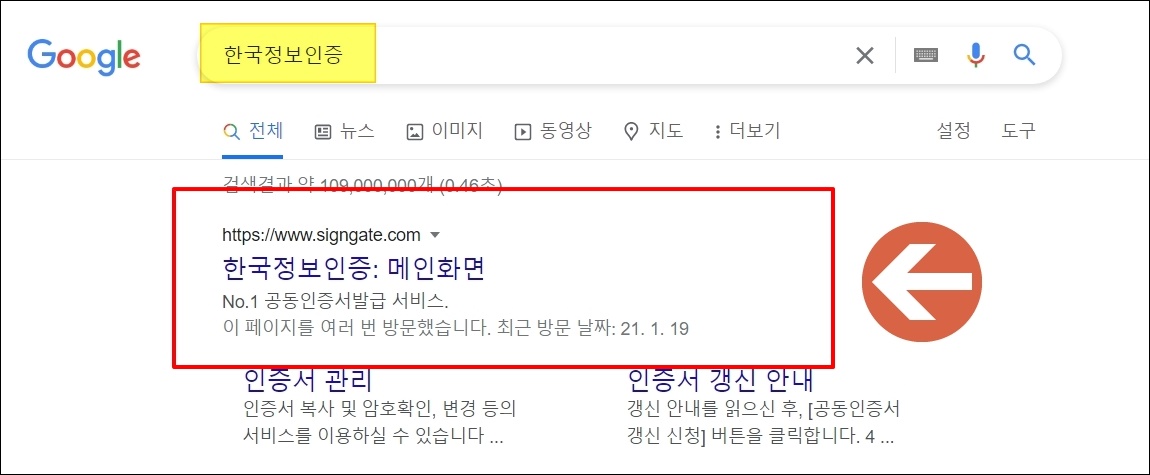 첫 번째 방법은 한국정보인증 사이트를 이용하는 방법입니다. 간단하게 검색을 통해 해당 사이트에 접속해 주세요.