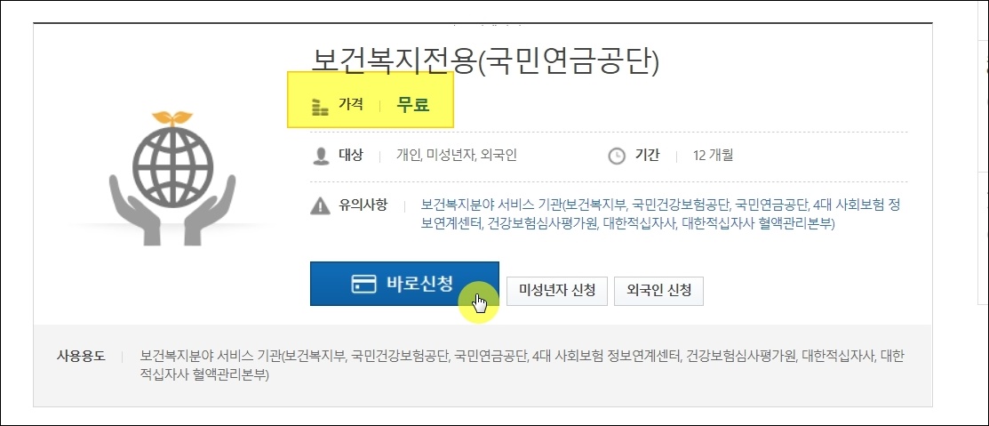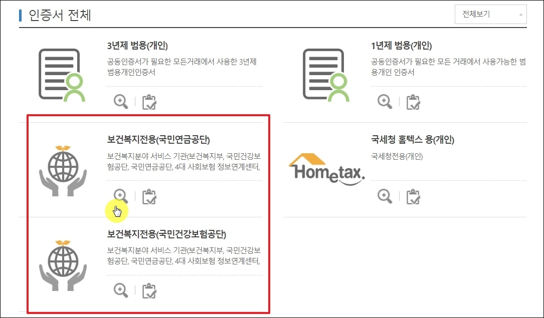 이곳에서는 범용 외에도 다양한 종류의 공동인증서 발급이 가능합니다. 여기에서 국민연금공단과 국민건강보험공단의 경우 무료로 신청 및 사용이 가능합니다.
