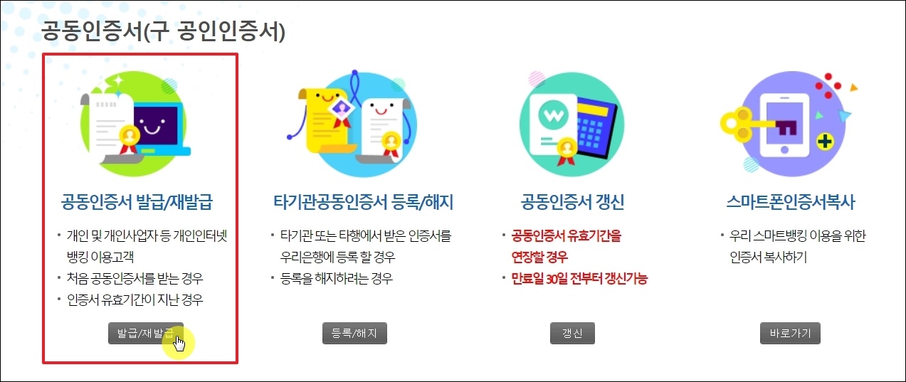 과거 공인인증서라고 불린 공동인증서를 발급, 등록, 해지, 갱신, 스마트폰 복사를 할 수 있는 페이지가 열렸는데요. 여기에서 첫 번째 메뉴를 선택합니다.