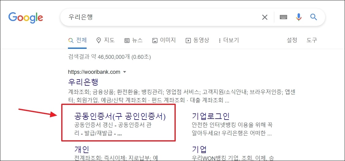 첫 번째 방법의 경우 보건복지 분야에만 사용할 수 있어서 아쉬움이 있는데요. 이번에는 범용 수준은 아니지만, 꽤 많은 곳에서 사용이 가능한 무료 공동인증서를 발급 받는 방법을 알려드리겠습니다. 바로 주거래 은행을 이용하는 방법인데요. 자주 사용하는 은행 공식 홈페이지에 인증서 발급 페이지로 이동해 주세요. 이렇게 검색하면 해당 페이지가 바로 나타납니다.