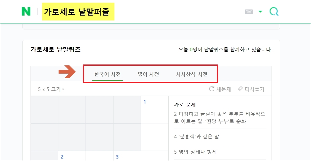 ▼우리가 이용할 퀴즈 문제는 간단하게 만나볼 수 있습니다. 네이버에서 제공하는 카로세로 낱말퍼즐 서비스를 이용하면 됩니다. 검색을 통해 바로 찾아갈 수 있죠. 여기서 보면 한국어 사전, 영어 사전, 시사상식 사전을 기반으로 만들어진 가로세로 낱말 넣기 게임이 마련되어 있음을 알 수 있습니다.