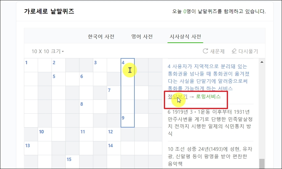 ▼시사 상식 퀴즈를 맞추는 방식은 간단합니다. 퍼즐 안에서 풀어보고 싶은 번호를 클릭합니다. 그럼 내용을 입력할 수 있도록 커서가 반짝 거립니다. 이 상태에서 우측에 있는 시사 상식 문제를 보고 이에 맞는 단어를 퍼즐 안에 적으면 됩니다. 정답을 보고 싶은 경우에는 [정답보기] 버튼을 클릭하면 바로 확인이 가능합니다.