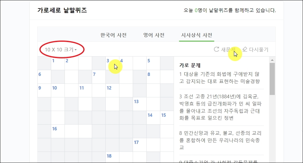 ▼가로세로 퍼즐의 크기가 너무 작다고 생각하면 5x5 사이즈에서 7x7 사이즈 또는 10x10 사이즈로 크기를 늘릴 수 있습니다. 시가 상식 퀴즈를 풀다가 너무 어렵거나 너무 쉬운 경우 [새문제] 버튼을 눌러 새로운 문제를 불러오는 것이 가능합니다. 처음부터 다시 풀고 싶을 때에는 [다시 풀기] 버튼을 클릭하면 됩니다.