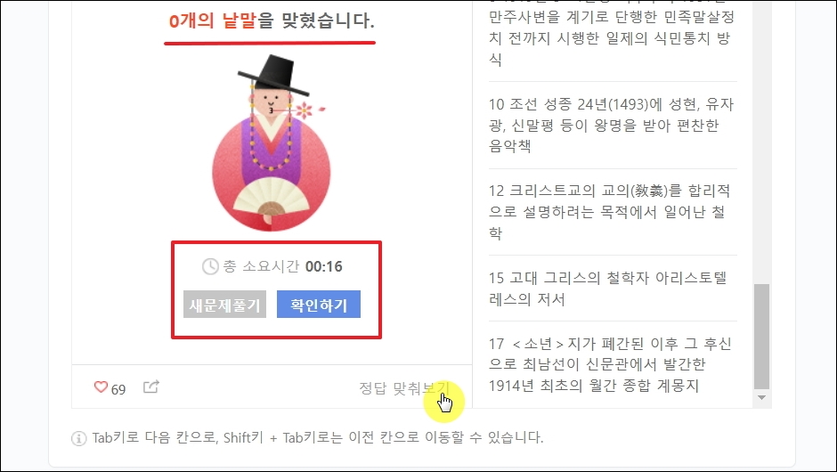 ▼퍼즐에 들어가는 시사 퀴즈를 모두 푼 이후 얼마나 맞추었는지 알고 싶다면 퍼즐 우측 하단에 있는 [정답 맞춰보기] 버튼을 클릭합니다. 그럼 몇 개의 시사 상식 퀴즈을 맞추었는지 알 수 있습니다. 퀴즈를 푸는 데에 소요된 시간 확인도 가능합니다.