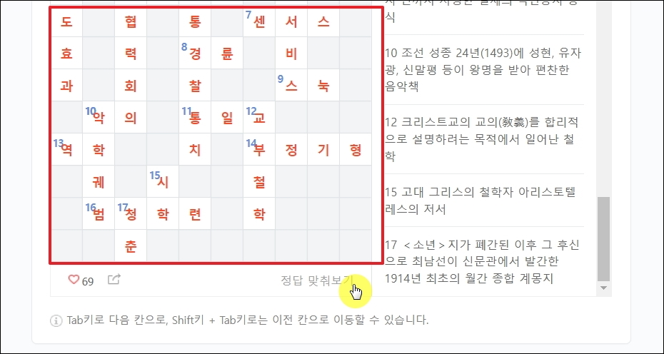 ▼정답 맞춰보기 창에서 [확인하기] 버튼을 클릭해 봅니다. 그럼 다음과 같이 가로세로 퍼즐에 정답이 표시가 됩니다. 안내 문구를 보면 마우스를 사용하지 않고도 퀴즈를 풀 수 있는 방법을 알 수 있습니다. 텝키를 누르면 다음 칸으로 이동하고, 쉬프트 키와 탭 키를 누르면 이전 칸으로 커서를 이동 시킬 수 있다고 합니다.