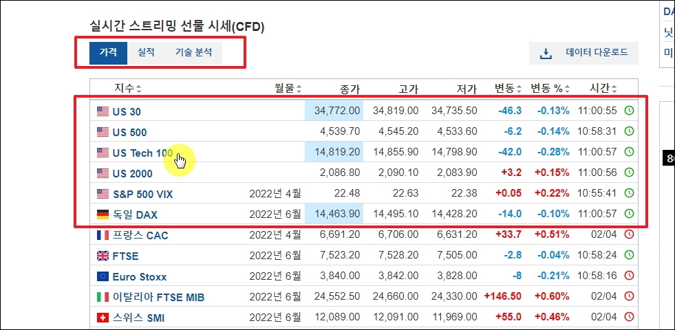 미국증시 실시간 선물지수 확인 및 예측하기.