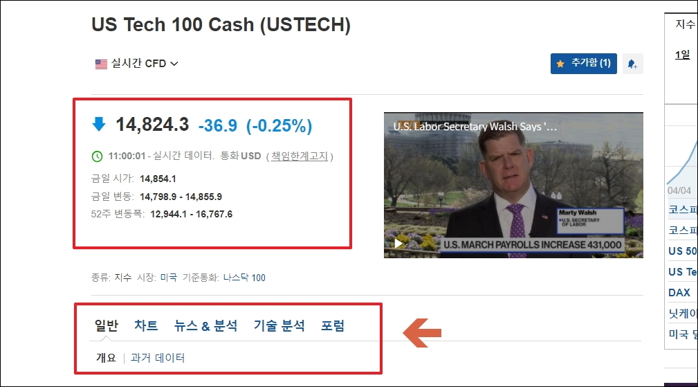 ▼US Tech 100 Cash는 미국증시 중 나스닥 선물지수를 의미합니다. 시세 부분을 보면 "실시간 데이터"라는 문구가 표시되어 있습니다. 메뉴를 보면 해당 지표에 대한 차트, 뉴스, 분석, 포럼 등의 정보를 제공하고 있다는 것을 알 수 있습니다.