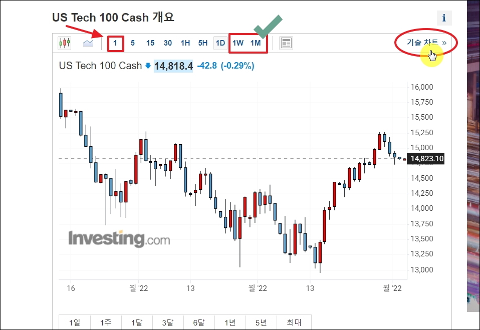 ▼화면을 조금만 내려보면 미국증시 선물지수에 대한 실시간 차트를 만나볼 수 있습니다. 1분봉을 켜 놓으면 아시겠지만, 장이 열렸을 때 실시간으로 그래프가 그려지는 것을 볼 수 있습니다. 전체적인 흐름을 보고 싶다면 주봉이나 월봉으로 보는 것이 좋습니다. [기술 차트]를 클릭하여 좀 더 전문적으로 차트를 확인해 보겠습니다.