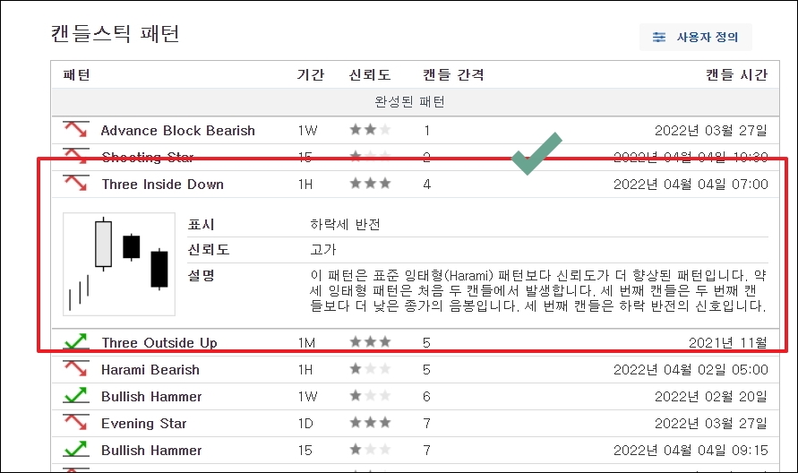 ▼캔들스틱 패턴 리스트를 통해 어떤 기간에 신뢰도가 높은 캔들 패턴이 나타났는지 알 수 있습니다. 해당 캔들에 대한 설명도 있기 때문에 캔들 공부에도 정말 좋습니다.