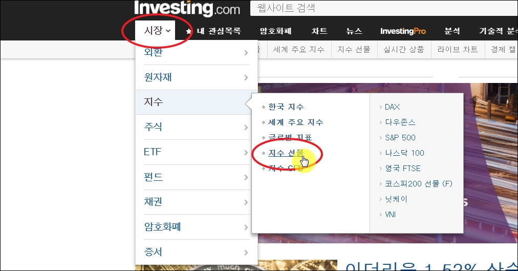 ▼일단 미국증시 실시간 선물지수 확인을 먼저 하도록 하겠습니다. 사이트 메인화면을 보면 가장 좌측에 [시장] 메뉴가 있습니다. 해당 메뉴를 클릭하면 외환, 원자재, 지수, 주식, 채권 등 다양한 투자 상품이 나타납니다. 여기에서 지수 카테고리를 선택하면 선물지수 메뉴가 나타납니다.