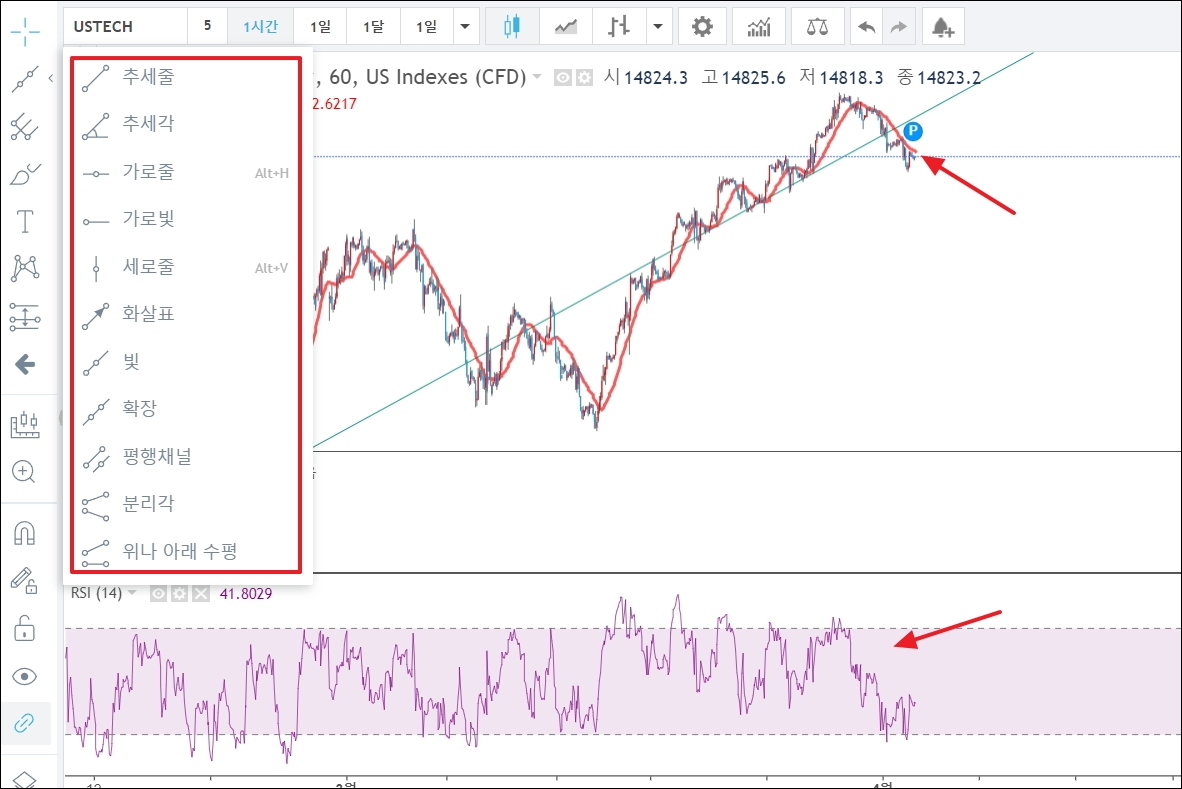 ▼인베스팅에서 제공하는 기술 차트 서비스의 경우 굉장히 많은 도구를 제공하고 있습니다. 추세선, 가로줄, 세롭줄 등의 도구를 사용하면 어느 부분이 지지선, 저항선인지 파악하는 데에 용이합니다. 추세선만 잘 그으면 앞으로의 미국증시 흐름 방향을 파악하는 데에 용이합니다. 보조지표인 RSI 값도 추가할 수 있으니 함께 보시길 바랍니다.
