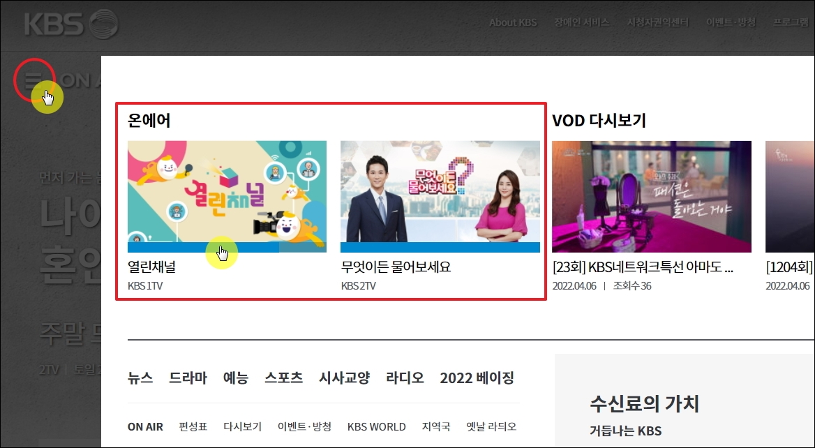 ▼사이트에 접속해서 어떻게 지상파 kbs2 실시간 방송보는곳 이용을 하는지 알려드리겠습니다. 홈페이지 메인화면을 보면 좌측 상단에 [메뉴] 아이콘이 있습니다. 해당 아이콘을 클릭하면 [온에어]와 [VOD 다시보기] 목록이 나타납니다. 보고 싶은데 놓친 TV 프로그램이 있을 때 VOD 다시보기 서비스를 이용하면 됩니다. 이번 시간에는 지상파 kbs2 실시간 방송을 보는 것을 알려드리겠습니다. KBS 2TV를 클릭해 보겠습니다.