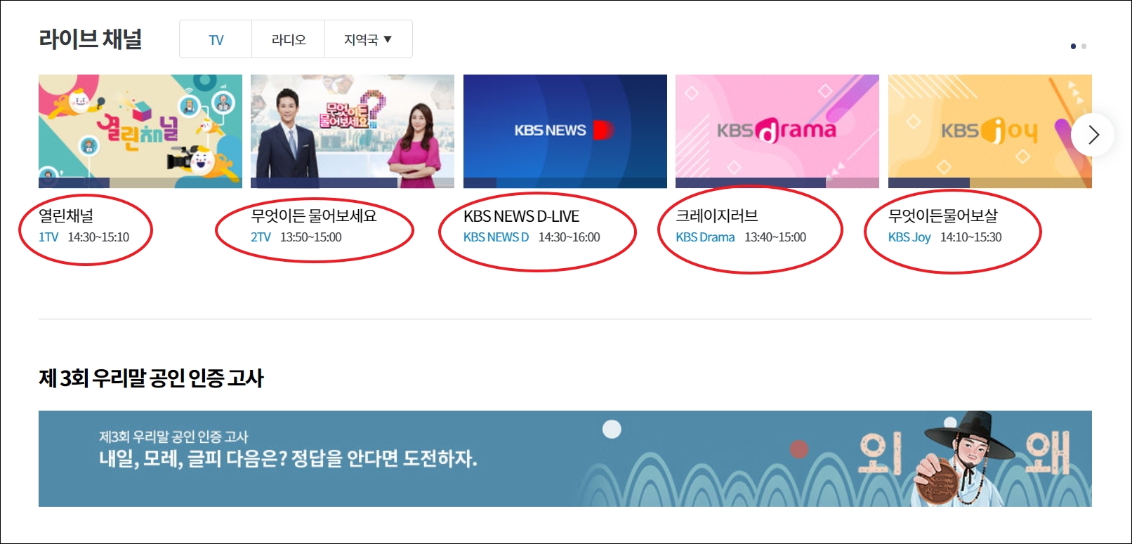▼제가 이용하는 방식을 통해 현재 kbs 방송국에서 실시간 방영되는 프로그램을 살펴보았습니다. 1TV에서는 "열린채널", 2TV에서는 그 유명한 "무엇이든 물어보세요", NEWS D-LIVE, 드라마 채널에서는 "크레이지러브", KBS JOY에서는 요즘 인기 있는 "무엇이든 물어보살"이 나오고 있습니다.