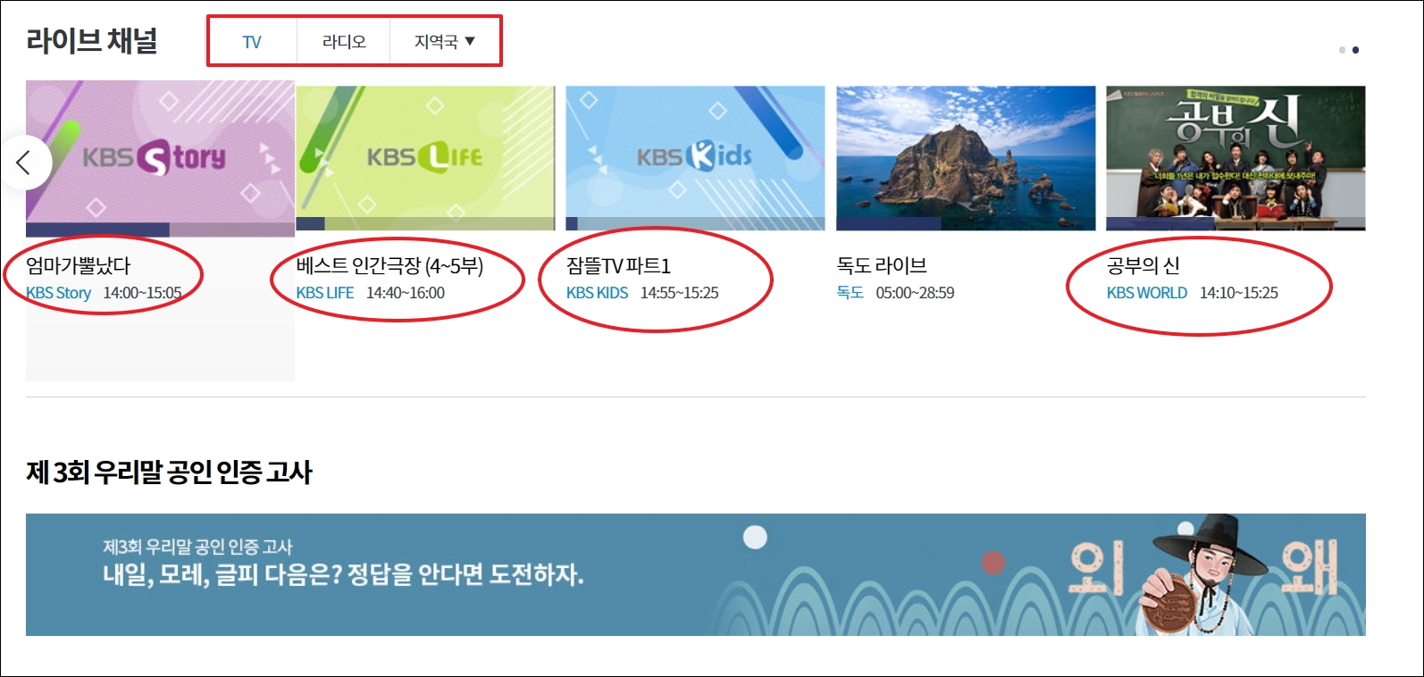 ▼KBS 공식 홈페이지는 방금 언급한 것을 포함한 여러 채널에 대하여 인터넷으로 방송보는곳 입니다. 물론 그 밖에 프로그램 소개나 커뮤니티 등의 서비스도 제공하고 있죠.