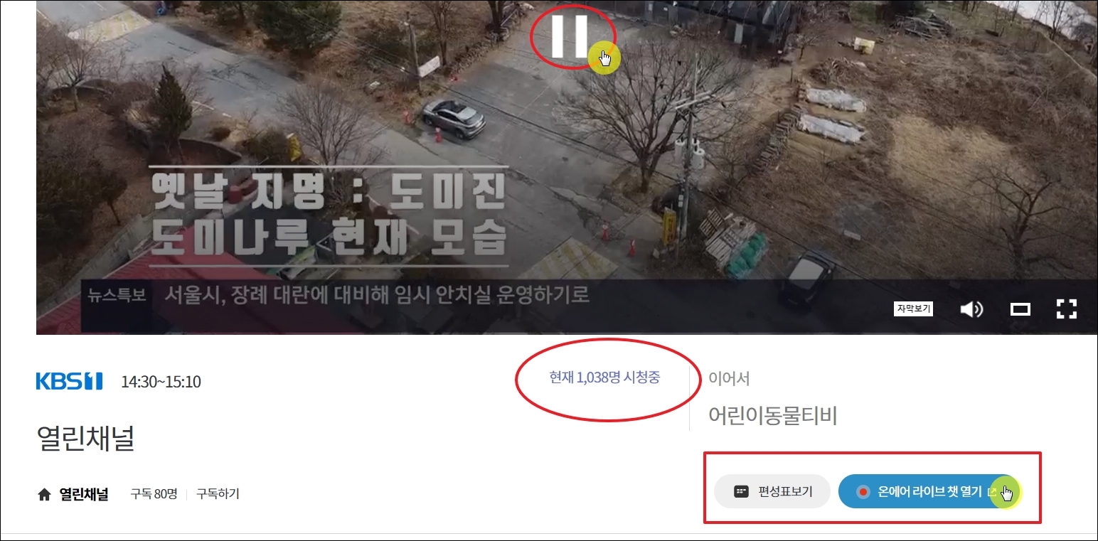 ▼바로 영상을 볼 수 있도록 동영상 플레이어가 나타납니다. 플레이어 중앙에 재생 버튼을 클릭하면 실시간 방송을 시청할 수 있습니다. 지상파는 kbs2 외에도 kbs1 채널이 있습니다. 지상파 채널을 감상하면서 이용자 간에 라이브 쳇을 통해 대화를 나누는 것도 가능합니다. 현재 실시간 방송보는곳을 이용하는 사람이 1,038명이나 되는 것을 알 수 있습니다.