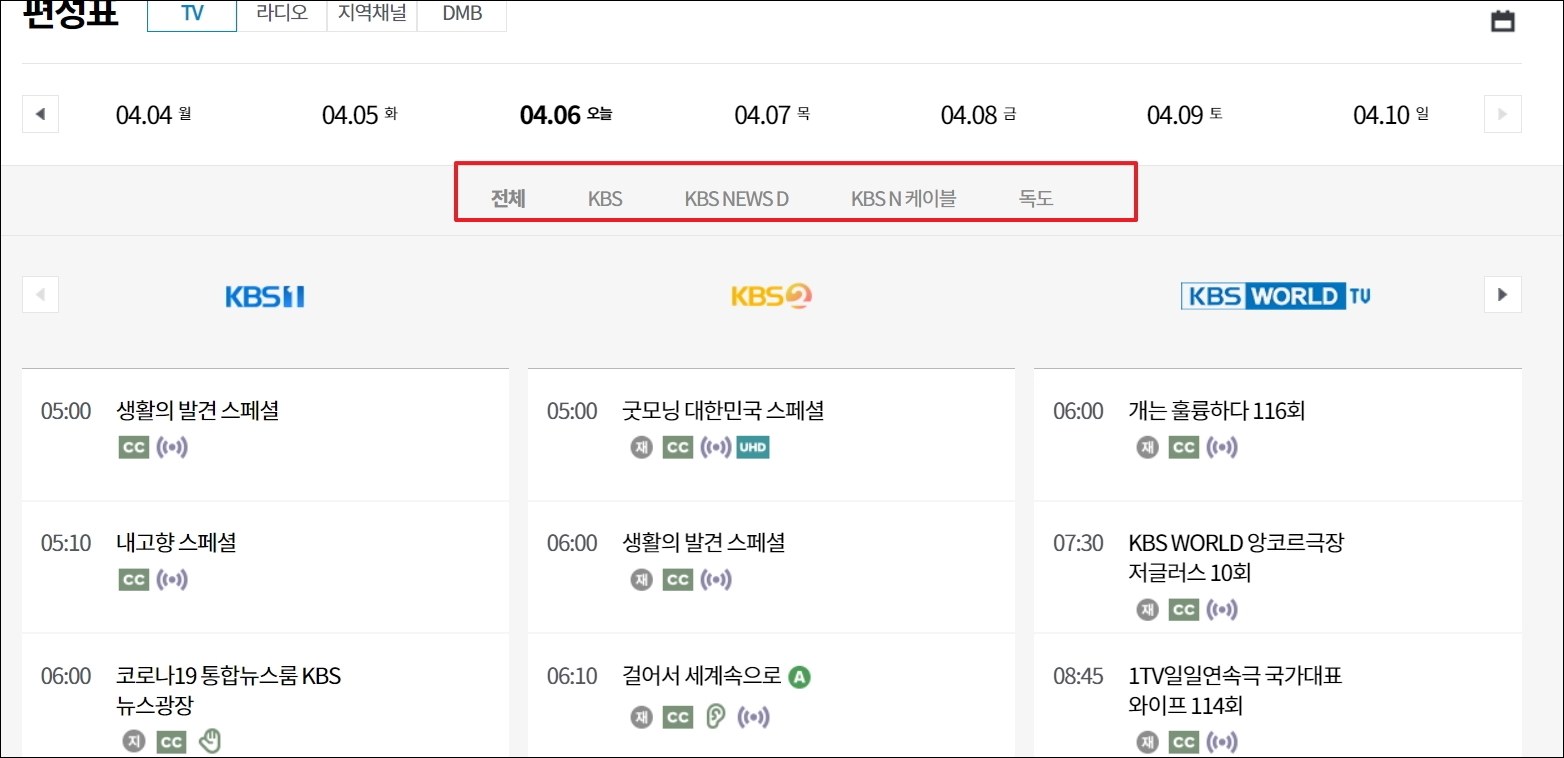 ▼기본이 되는 지상파 kbs1 kbs2 채널 외에도 관련 케이블 방송에 대한 편성표를 모두 살펴볼 수 있습니다.