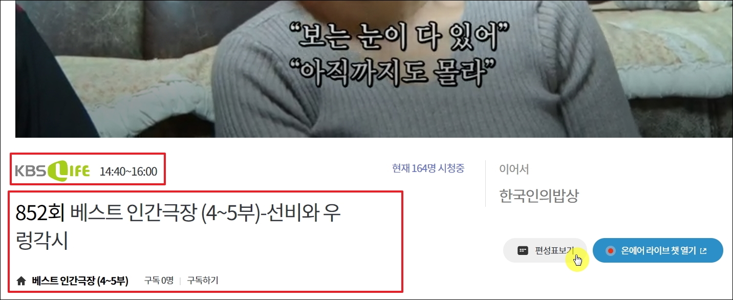 ▼정말 오랜 기간 많은 사람에게 사랑 받는 TV 프로그램인 인간극장도 볼 수 있습니다. 보고 싶은 방송 프로그램이 있는 경우에는 [편성표 보기] 버튼을 클릭하여 언제 실시간 방영이 되는지 확인할 수 있습니다.