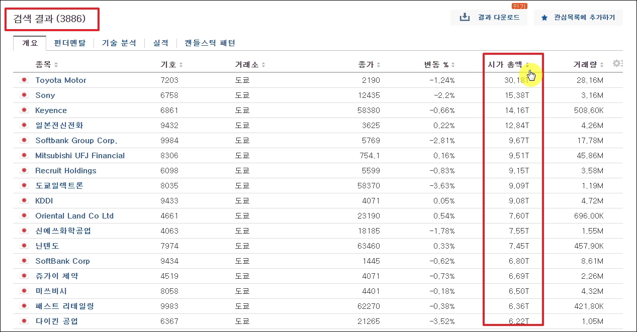▼검색 결과가 나타났습니다. 일본 시가총액 상위종목이 보입니다. 한 번에 3886개의 주식 종목이 나오기 때문에 한 화면에 담기 어렵습니다. 이런 연유로 직접 인베스팅 사이트를 이용할 수 있도록 방법을 알려드리는 겁니다.